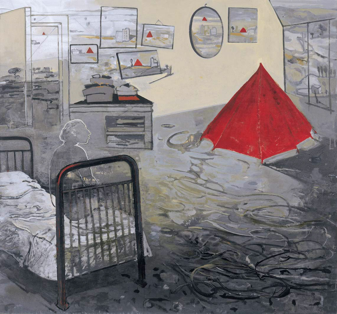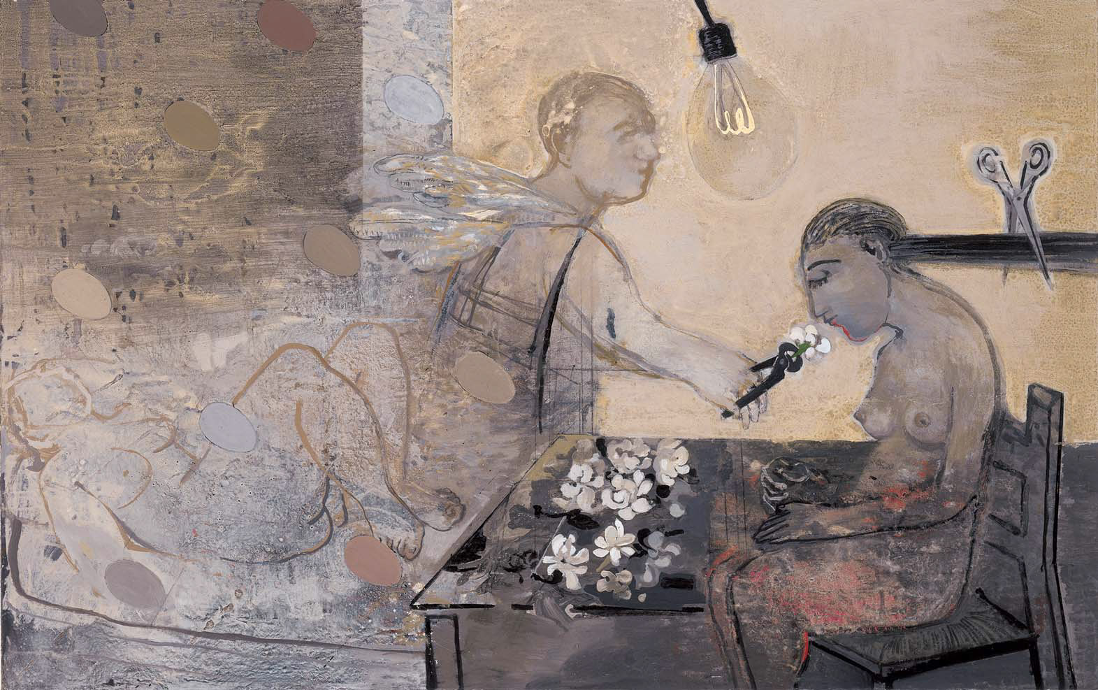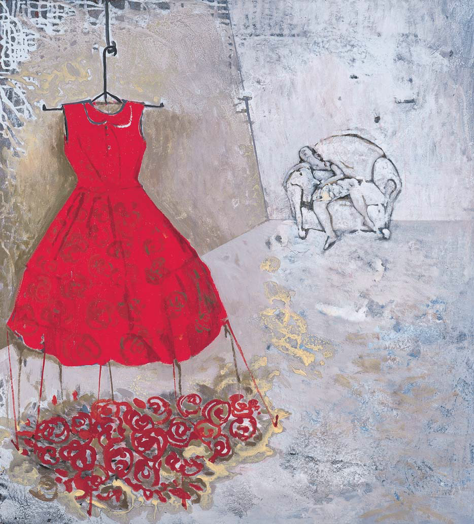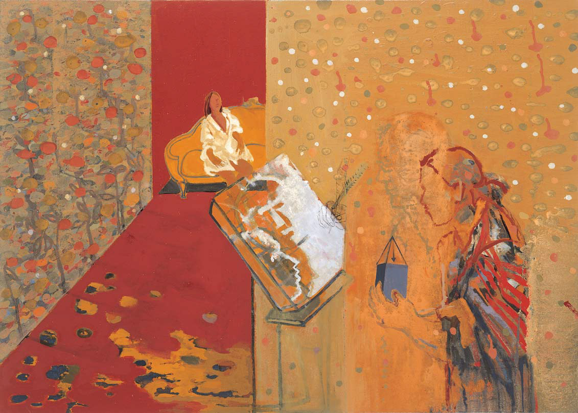 “Η καταγωγή του κόσμου” θα μπορούσε ν’ αποτελεί τον τίτλο αυτής της έκθεσης της Ηώς Αγγελή. Όμως, εδώ, ο τίτλος είναι “Ιδιωτικός χώρος”, ο χώρος των γυναικών – που δεν είναι παρά εκείνος όπου συναντούν τους άνδρες και τον εαυτό τους· ο χώρος όπου ονειρεύονται κι όπου πλάθουν ανθρώπους και παραμύθια. Παραμύθια με πολλαπλά νοήματα, μιας και στην πραγματικότητα η Κοκκινοσκουφίτσα καταβροχθίζει τον κακό λύκο, μιας και το αθώο κοριτσάκι μεγαλώνει και ψηλώνει δίπλα στο πεδίο της μάχης και μέσα στο βουητό των πολεμικών αεροπλάνων. Τα φορέματα είναι κόκκινα σαν φλόγες: με τέτοια φορέματα εισβάλλει κανείς ορμητικά μέσα στον κόσμο’ το παρελθόν λειώνει, ματώνοντας στο παρόν. Τα δωμάτια είναι πορτοκαλιά, όπως η δύση· και η ώρα του Ευαγγελισμού κόβεται βίαια μ’ ένα ψαλίδι. Όπως ο χρόνος κι όπως το νήμα της ζωής. Η ζωή είναι εύθραυστη, οι ώρες αβέβαιες· στον ιδιωτικό χώρο εισδύει πάντα ένας ξένος. Το δωμάτιο δεν είναι ποτέ δικό σου: μες απ’ τις ρωγμές, μες απ’ τις χαραμάδες, καραδοκεί το εξωτερικό σύμπαν. Οι γυναίκες παντρεύονται ένα ποίημα, όπως έγραφε ο Keats, και, καμιά φορά, ξαπλωμένες σ’ αυτά τα υγρά σεντόνια γεννούν τα έργα της τέχνης.