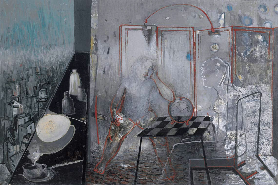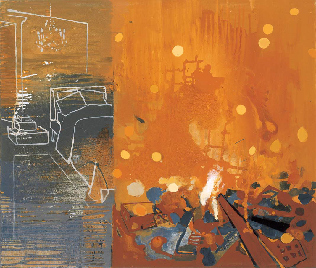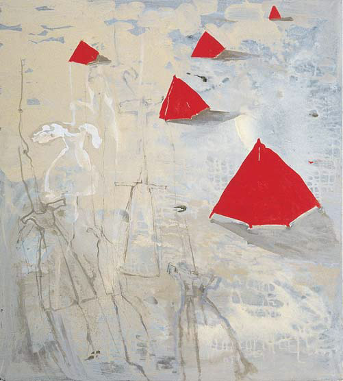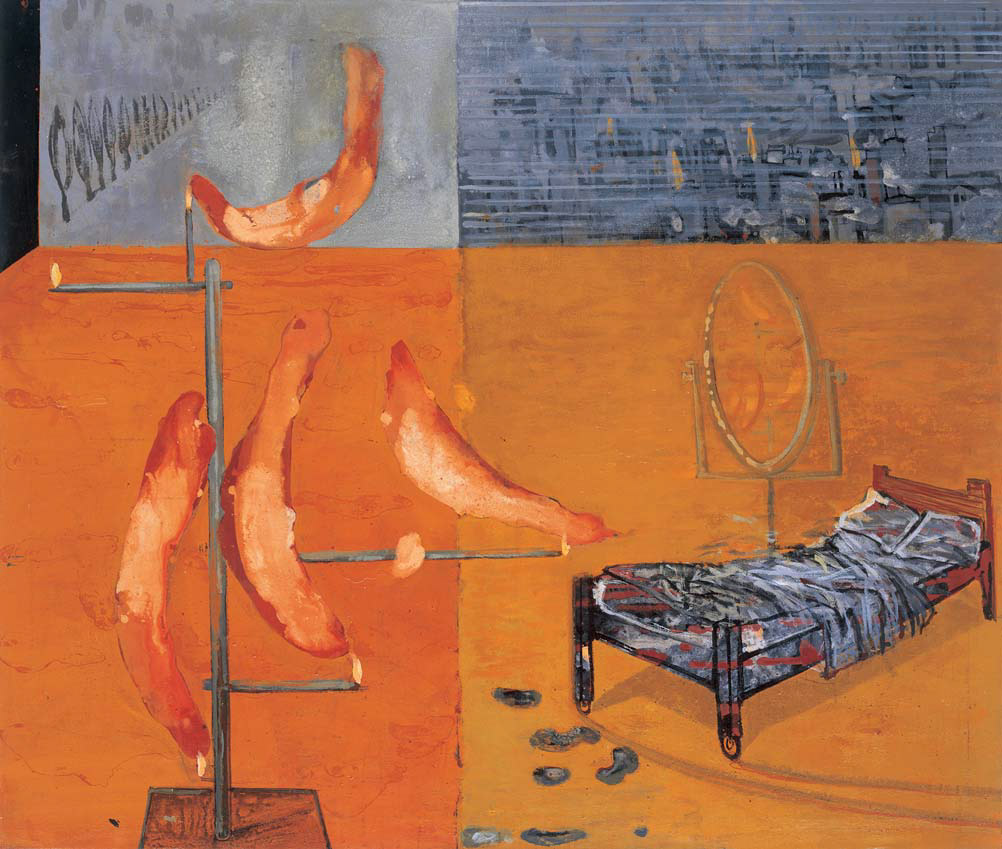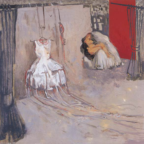 “Η καταγωγή του κόσμου” θα μπορούσε ν’ αποτελεί τον τίτλο αυτής της έκθεσης της Ηώς Αγγελή. Όμως, εδώ, ο τίτλος είναι “Ιδιωτικός χώρος”, ο χώρος των γυναικών – που δεν είναι παρά εκείνος όπου συναντούν τους άνδρες και τον εαυτό τους· ο χώρος όπου ονειρεύονται κι όπου πλάθουν ανθρώπους και παραμύθια. Παραμύθια με πολλαπλά νοήματα, μιας και στην πραγματικότητα η Κοκκινοσκουφίτσα καταβροχθίζει τον κακό λύκο, μιας και το αθώο κοριτσάκι μεγαλώνει και ψηλώνει δίπλα στο πεδίο της μάχης και μέσα στο βουητό των πολεμικών αεροπλάνων. Τα φορέματα είναι κόκκινα σαν φλόγες: με τέτοια φορέματα εισβάλλει κανείς ορμητικά μέσα στον κόσμο’ το παρελθόν λειώνει, ματώνοντας στο παρόν. Τα δωμάτια είναι πορτοκαλιά, όπως η δύση· και η ώρα του Ευαγγελισμού κόβεται βίαια μ’ ένα ψαλίδι. Όπως ο χρόνος κι όπως το νήμα της ζωής. Η ζωή είναι εύθραυστη, οι ώρες αβέβαιες· στον ιδιωτικό χώρο εισδύει πάντα ένας ξένος. Το δωμάτιο δεν είναι ποτέ δικό σου: μες απ’ τις ρωγμές, μες απ’ τις χαραμάδες, καραδοκεί το εξωτερικό σύμπαν. Οι γυναίκες παντρεύονται ένα ποίημα, όπως έγραφε ο Keats, και, καμιά φορά, ξαπλωμένες σ’ αυτά τα υγρά σεντόνια γεννούν τα έργα της τέχνης.